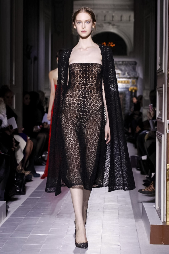 I colori di questo mondo immerso nella quiete sono il bianco virginale e l’avorio senza che però la natura e Valentino possano fare a meno del rosso. E senza che l’eleganza, di quella che resta pur sempre solo una citazione della natura con i mezzi dell’arte, possa fare a meno del nero e degli abiti fascianti dalle linee geometriche.