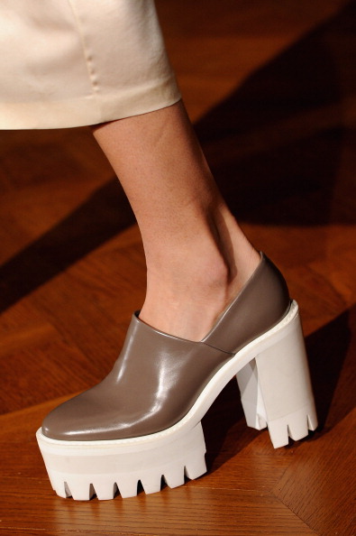 Suola con carrarmato per il mocassin in pelle per Stella McCartney e eleganza vagamente retrò per il sandalo in pelle open toe per Louis Vuitton. Ma la scarpa simbolo delle passerelle autunno inverno 2013-14 è quella firmata Dolce & Gabbana, una zeppa gabbia adornata di fiori. sandali in pelle con fascia che abbraccia la caviglia per Prada e a tutto nudo, per la donna Vionnet, che incurante del freddo dovrà indossare i sandali in oro che salgono fin sopra la caviglia. Alexander McQueen veste il piede con una scarpa di ispirazione settecentesca e infine Giambattista Valli presenta uno stivaletto a rete aperto in punta.