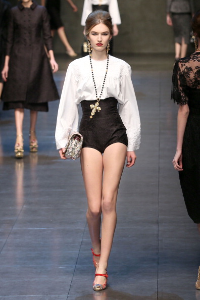 Infine gli abiti di Nina Ricci, costruiti a bustier, con giochi di pizzo e trasparenze che scoprono le coulotte retrò e i micro bustier futuristici. Questo concetto non è certo nuovo, tra i primi a costruirci un vero e proprio mood ci sono Jean Paul Gaultier e Dolce & Gabbana.