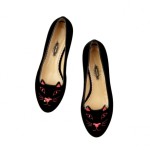 Solo pochi pezzi e, per prime, le ballerine iconiche con il muso da gatto in velluto nero che, per l’occasione, si tinge di toni fluo e “indossa” piercing metallici al naso e alle orecchie. Poi le classiche pump con tacco altissimo e plateau metalizzato tempestato di piccole spille d’argento.